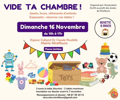 Vide ta chambre ! Faites le tri, libérez de l’espace et trouvez des trésors à offrir ou à recycler. L'occasion parfaite pour alléger vos placards et préparer des fêtes pleines de magie. Ne manquez pas ce rendez-vous festif et convivial ! Dimanche 16 novembre.