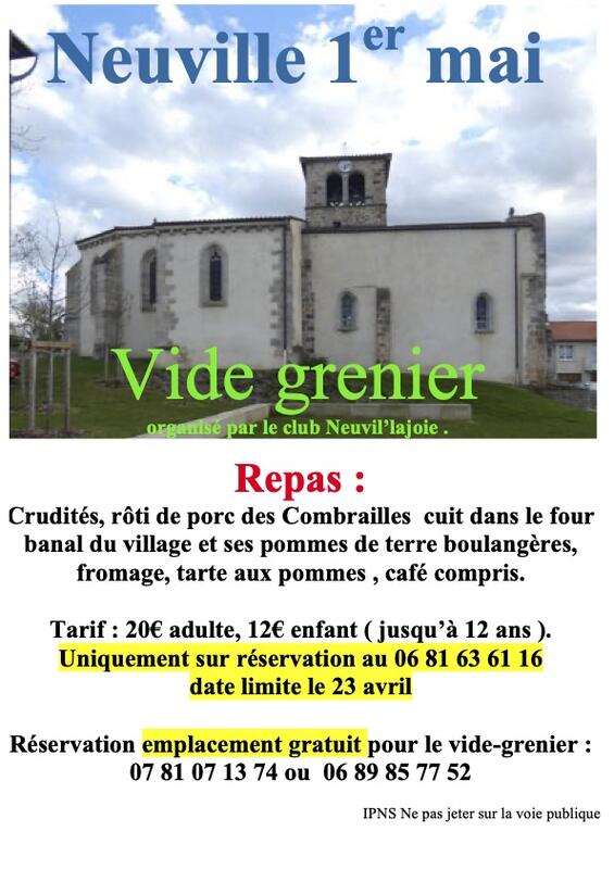 Restauration sur place : menu / crudités, rôti de porc des combrailles cuit dans le four banal du village et ses pommes boulangères, fromage, tartes aux pommes, café compris. Réservation avant le 23 avril. Tarif : 20€ adulte, 12€ enfant jusqu'à 12 ans.