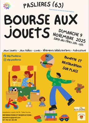 Venez exposer ou acheter vos jeux/jouets pour enfants, livres, matériel de puériculture, vêtements bébé ou enfants à la bourse aux jouets de paslieres (63290) 10h-16h.