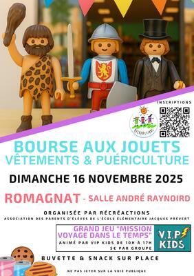 Dimanche 16 novembre, l'association récréactions de parents d'élèves de l'école primaire jacques prévert de romagnat organise de 9h à 18h une bourse aux jouets, vêtements d'enfants et articles de puériculture à la salle andré raynoird de romagnat. Un service de restauration sera disponible sur place. Noël approche, faites un geste pour la planète en achetant des objets d'occasion ! Tous les bénéfices seront reversés à l'école jacques prévert de romagnat.