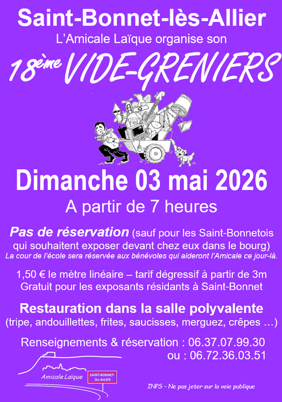 Le 18ème vide-greniers de saint-bonnet-lès-allier aura lieu le dimanche 3 mai, de 7h à 18h, dans le bourg de notre village, la cour de l'école et la salle polyvalente.