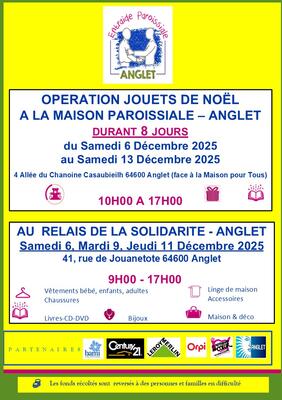 Operation vente de "jouets de noel" du samedi 6 decembre au samedi 13 decembre 2025 de 10h00 à 17h00 y compris le dimanche à la "maison paroissiale" 4 allée du chanoine casaubieilh - 64600 anglet (en face de la maison pour tous)