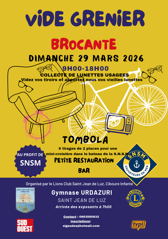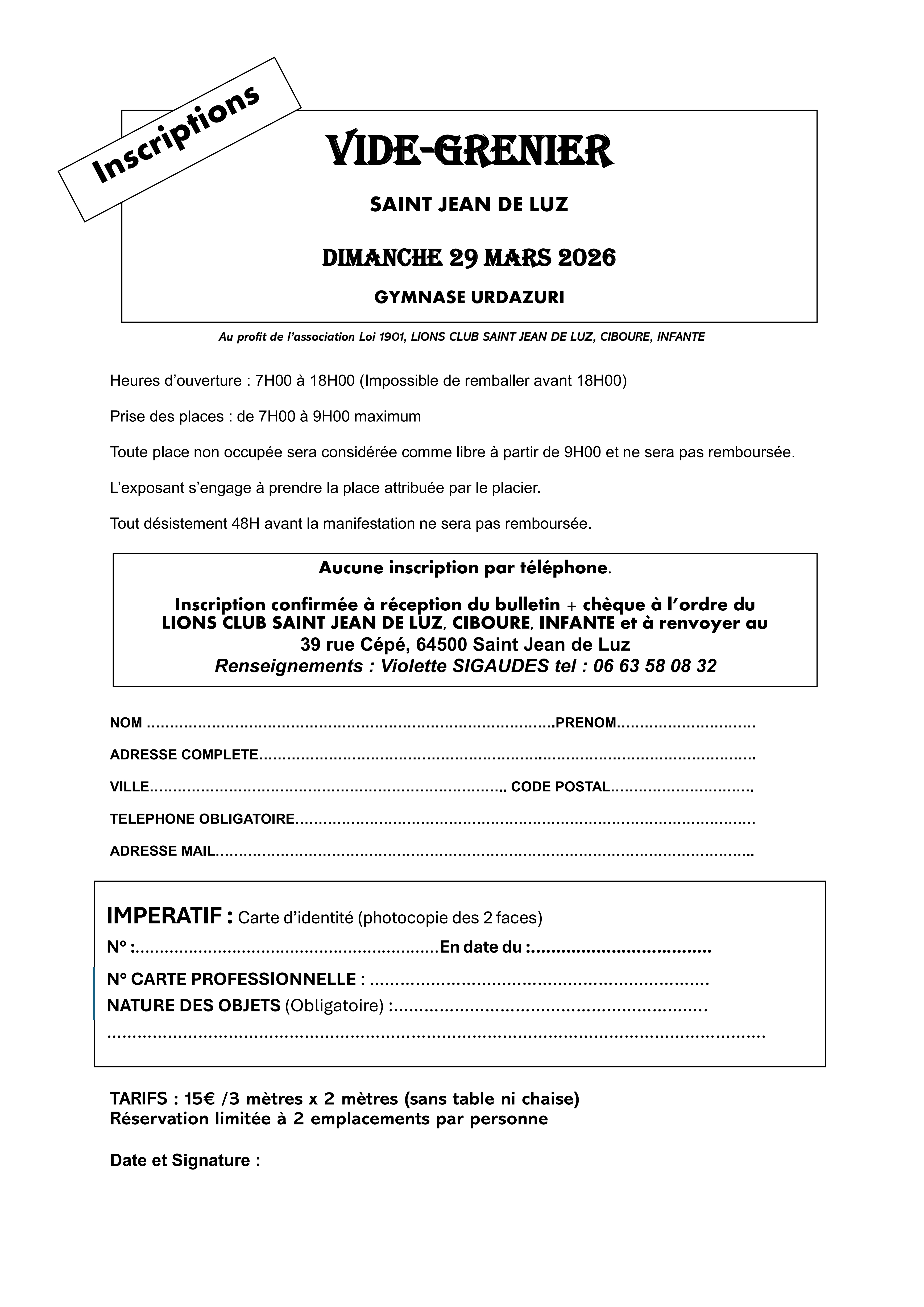 " les brocanteurs professionnels ou occasionnels ( particuliers) sont invités à participer à la brocante organisée comme chaque année par le lions club saint jean de luz, ciboure, infante le dimanche 29 mars au gymnase urdazuri de saint jean de luz, 1 avenue du professeur grégorio marañón de 7h00 à 18h00.