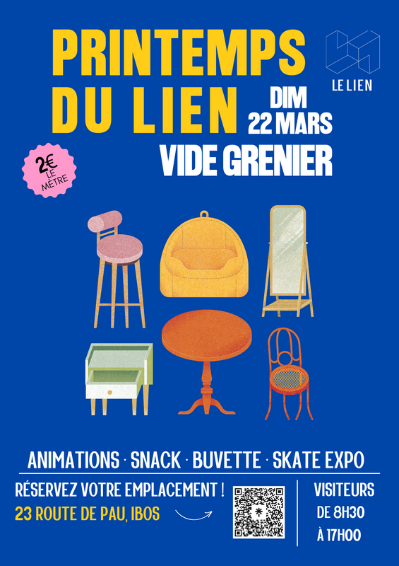 Le printemps du lien fait son grand retour pour sa 5ème édition ! Venez découvrir de nombreuses trouvailles lors de notre vide-grenier convivial, organisé par le lien ! Au programme : tout au long de la journée, nous proposerons des ateliers créatifs et des animations ludiques pour les adultes et les enfants. En parallèle, buvette et restauration seront sur place pour vous permettre de profiter de la terrasse du lien. Vous pourrez également assister à l’événement annuel de bigoride, le club de skate installé au lien. - compétitions - exposition sur le skate - projection - tatouages - ateliers recyclage des planches le programme détaillé est à venir pensez à le consulter via nos réseaux ig:https://www.instagram.com/lelien.py/ fb:https://www.facebook.com/LeLienPyrenees/?locale=fr_FR contact: avons hâte de vous accueillir et de partager cette belle journée avec vous !