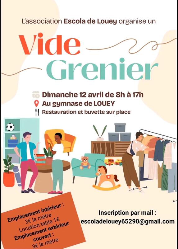 ???? vide-grenier à louey ???? envie de faire de la place à la maison ? Ou plutôt de dénicher la perle rare à petit prix ? L’association escola de louey organise son vide-grenier le dimanche 12 avril ! Venez vendre, chiner, vous balader et passer un moment convivial tarifs exposants : intérieur : 3€ le mètre + 1€ la location de table ⛱ extérieur couvert : 3€ le mètre pour réserver votre emplacement : envoyez un mail à avec : • nom et prénom • numéro de téléphone • adresse • le métrage souhaité à l’intérieur ou à l’extérieur • si vous souhaiter louer une table (à l’intérieur uniquement) •si vous êtes particulier : il faudra fournir le jour j une attestation sur l'honneur de non participation à 2 autres manifestations de même nature dans l'année. •si vous êtes professionnel : votre numéro d'immatriculation au registre des commerces dimanche 12 avril louey partagez l’info autour de vous et venez nombreux chiner ou vendre !