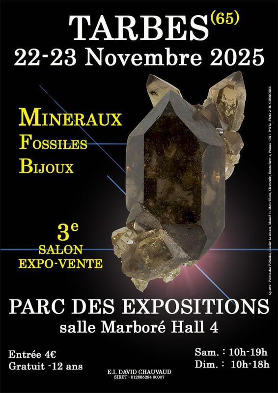 Hexagone mineral vous donne rendez-vous les 22 et 23 novembre 2025 à tarbes (hautes-pyrénées) pour le 3e salon mineraux fossiles bijoux. Cet événement se déroulera dans la salle marbore (hall 4) du parc des expositions situé sur le boulevard du président kennedy. Pour animer cet événement, entre 20 et 25 exposants professionnels et amateurs, connus pour la qualité de leur stand seront présents. Ces spécialistes montreront aux visiteurs leurs dernières nouveautés en provenance du monde entier, des quatre coins de france et bien sûr des pyrénées. Pour répondre toujours plus aux attentes du public, un service d'expertise gratuite sera aussi proposée par l'organisateur à celles et ceux qui souhaitent faire déterminer leurs découvertes minéralogiques ou paléontologiques. Les collectionneurs comme les curieux pourront découvrir à cette occasion de nombreux minéraux et fossiles provenant de la chaîne des pyrénées avec de belles surprises sorties des collections pour l'occasion. Ce salon ravira les collectionneurs toujours à la recherche de spécimens esthétiques et rares et émerveillera à coup sûr les néophytes et les plus jeunes en les sensibilisant au patrimoine minéralogique de la région.