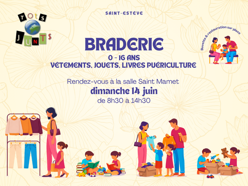 Réservation d'emplacements ici : https://www.helloasso.com/associations/tots-junts-per-la-bressola-de-saint-esteve/evenements/braderie-de-printemps-2026