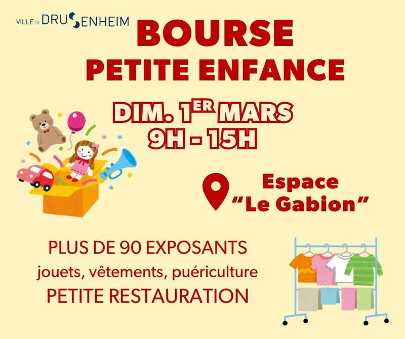 L'association drus'écoles organise une bourse petite enfance le dimanche 1er mars de 9h à 15h : vêtements pour enfants, matériel de puériculture, vêtements de grossesse, livres, jouets, etc.