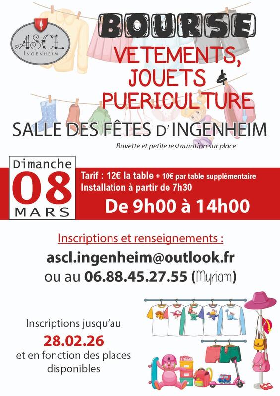 Nous sommes ravis de vous accueillir le dimanche 8 mars, de 9h à 14h, à la salle des fêtes d’ingenheim, pour une matinée placée sous le signe des bonnes affaires et de la convivialité.