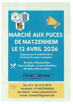 Le football club de matzenheim ainsi que l'amicale des sapeurs pompiers vous invitent à participer à l'édition 2026 de notre traditionnel marché aux puces !