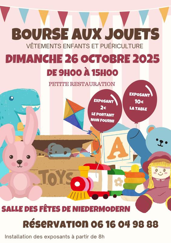 Bourse aux jouets, puériculture et vêtements enfants organisée par l'association des donneurs de sang du val de moder et l'association des parents d'élèves de niedermodern l'ape les enfants du steinberg.
