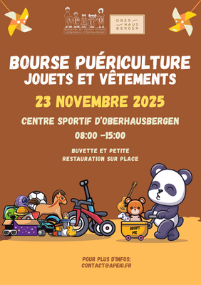 Traditionnelle bourse automnale de puériculture organisée par l’association des parents d’élèves d’oberhausbergen. Vente d’articles à destination d’enfants de moins de 12 ans : habits, livres, jeux, jouets, objet de puériculture