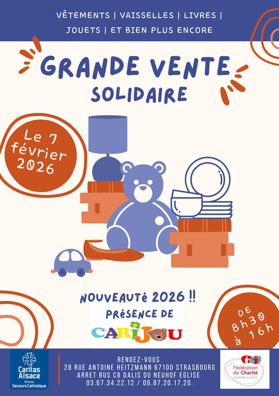 À la suite d’un sinistre fin septembre 2025, l’équipe caritas neuhof n’a pu honorer sa grande vente d’octobre. C’est donc naturellement qu’elle vous en propose ce samedi 7 février. Comme à chaque fois à vous y trouverez des belles choses, à petit prix : bibelots, vaisselle, ustensiles de cuisine, petit électro-ménager, vêtements, chaussures, sacs, linge de maison, broderies, bijoux, tableaux, disques, livres, … pour la vente de jouet, l’équipe caritas neuhof a invité l’entreprise d’insertion carijou à tenir son stand.