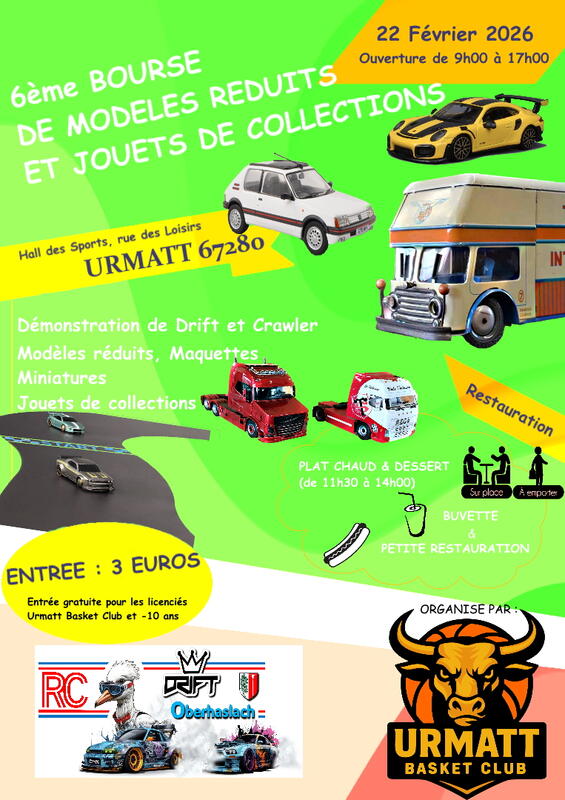 Le urmatt basket club organise le 22 février 2026 sa 6ème bourse d’échange internationale de modèles réduits, maquettes, miniatures, jouets de collections