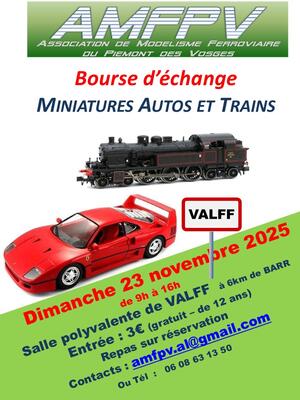 Amateurs de miniatures autos et trains, rendez-vous à la salle polyvalente de valff le 23 novembre prochain. Organisée par l'amfpv (association de modélisme ferroviaire du piémont des vosges) cette bourse réunira plus de 30 exposants de 9h à 16h. Vous y trouverez des centaines de véhicules miniatures de diverses échelles, des trains miniatures et des éléments de décor ; une bourse diversifiée qui ravira les collectionneurs et les « petits et grands enfants ». Entrée 3€, gratuit pour les enfants de moins de 12 ans. Bar et restauration sur place. A midi repas chaud : noix de jambon, frites, crudités, dessert, café au prix de 14€ sur réservation ou par mail