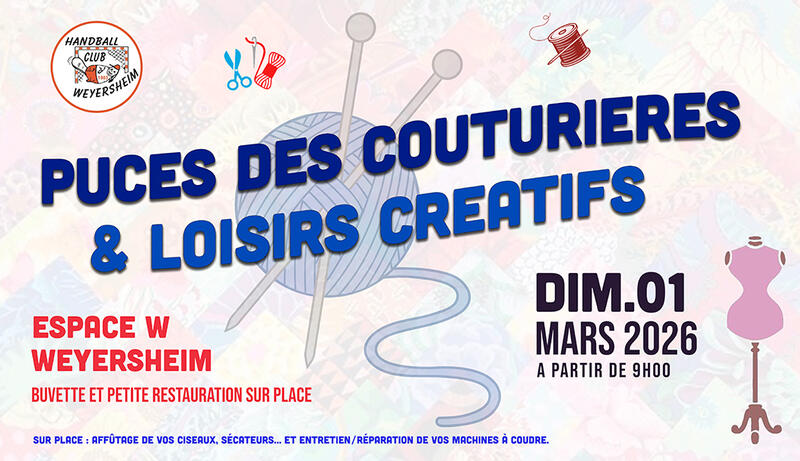 Le handball club de weyersheim organise sa 11ème édition des puces des couturières et loisirs créatifs le dimanche 1er mars 2026 de 9h à 16h à l’espace w rue des prés à weyersheim.