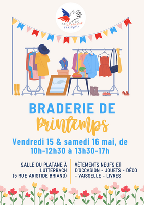 les bénévoles du secours populaire du haut-rhin ont le plaisir de vous inviter à leur braderie de printemps.