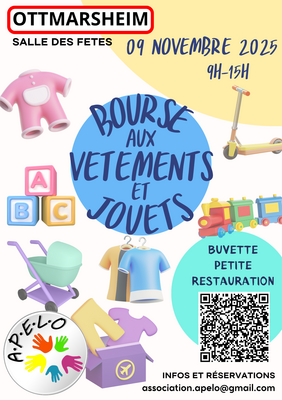 Zébulon a encore grandi ? Pimprenelle voudrait toutes les robes de la terre ? La chambre et l'armoire de numérobis sont saturées de vêtements qu'il ne porte plus ? Venez faire des bonnes affaires dans un cadre convivial. Une buvette avec boissons chaudes et rafraîchissements, et vente de gâteaux aux profits de l'association, sont assurés toute la journée, et une petite restauration vous y attendra. Ça se passera où ? Salle polyvalente d'ottmarsheim 3 rue de la piscine 68490 ottmarsheim quels sont les horaires ? L'entrée est libre pour les visiteurs à partir de 9h00 jusqu'à 14h00. Les exposants s'installeront à 7h30, et auront libéré la salle pour 15h. Quelle est la participation des exposants ? Téléchargez le formulaire à remplir en suivant le lien vers notre boutique 100% sécurisée le prix de chaque emplacement = 13€. Tout exposant souhaitant soutenir l’association est invité à fournir à son arrivée, une pâtisserie faite maison qui sera vendue aux profits d’apelo. Renseignements et réservations : pour toute question, n'hésitez pas à prendre contact avec nous! Par mail : et suivez-nous sur facebook, apelo - association des parents d'enfants liés à ottmarsheim, nous serons au rdv!