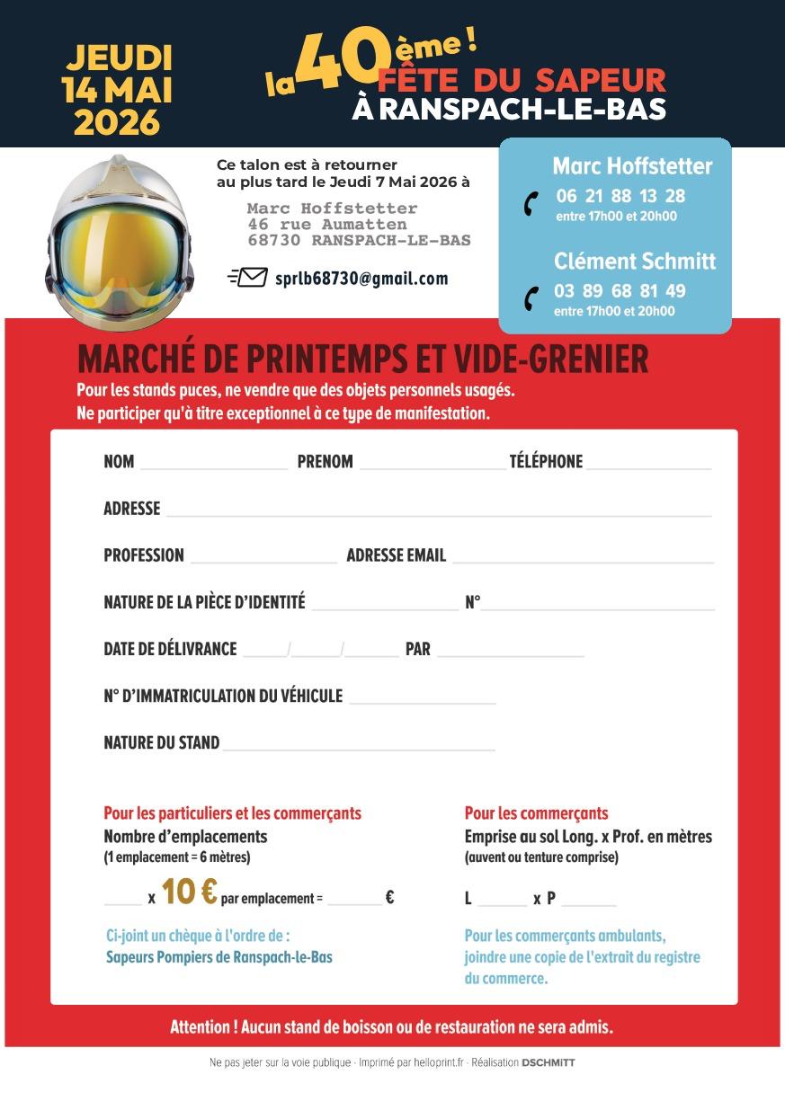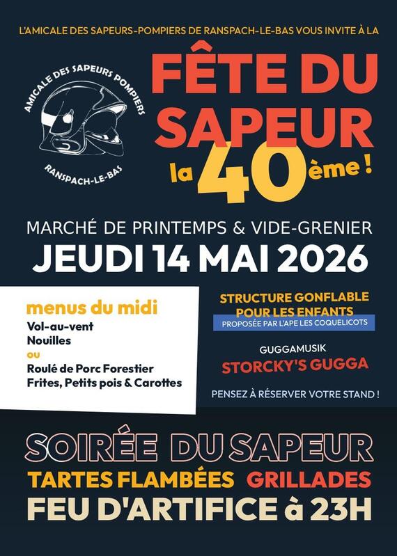 l’amicale des sapeurs-pompiers de ranspach-le-bas vous invite à célébrer la 40e édition de la fête du sapeur, accompagnée de son marché de printemps et de son vide-grenier. Cet événement convivial en alsace rassemble chaque année habitants et visiteurs autour d’animations, de restauration et de nombreux exposants.