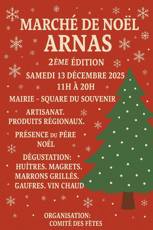 Marché de noël , en extérieur autour de la mairie et dans le parc. Artisanat et produits locaux. Animations enfants . Présence du père noel . Dégustations huitres , magrets, foie gras . Vente de vin chaud ( rouge et blanc), chocolat chaud , gaufres, marrons grillés , hot dogs. Buvette