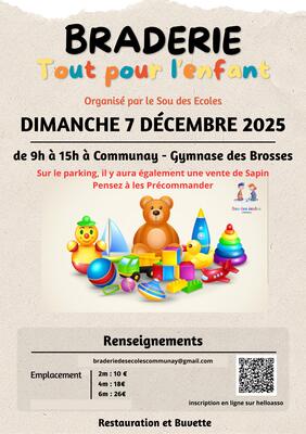 Braderie tout pour l'enfant organisée par le sou des écoles : articles de puériculture, vêtements, jouets, livres…