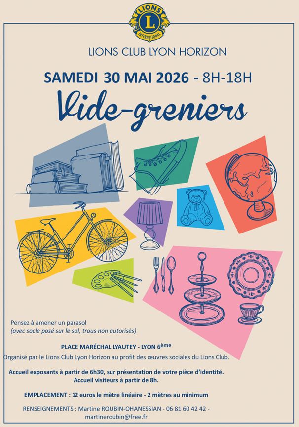 Cela se passe dans votre quartier "place maréchal lyautey" le samedi 30 mai 2026 (8h - 18h). Vide-greniers qui s'adresse aux personnes qui veulent vider un peu leurs placards en prenant un emplacement. (~150 exposants par an) cette 13ème édition s'adresse à tout le monde pour flâner dans le quartier et profiter des stands pendant cette journée. Journée organisée par lions club lyon-horizon au profit des œuvres sociales. Accueil exposant à partir de 6h30, sur présentation de votre pièce d'identité. Tarif exposant : 12 € le mètre linaire - 2 mètres au minimum martine roubin-ohanessian -- uniquement pour les particuliers - 14ème édition avec ~150 exposants