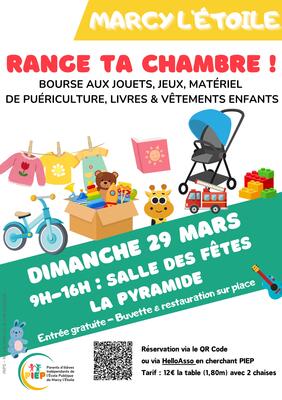 Les bénévoles de l'association indépendante des parents de l'ecole publique de marcy l'etoile organisent leur 2ème édition du vide grenier "range ta chambre !" autour de l'enfant le dimanche 29 mars 2025 de 9h à 16h à la salle de la pyramide à marcy l'etoile.