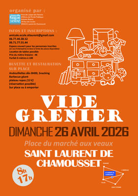 Vide-greniers organisé par l'amicale laïque antoine boiron, association des parents d'élèves de l'école publique de st laurent de chamousset.
