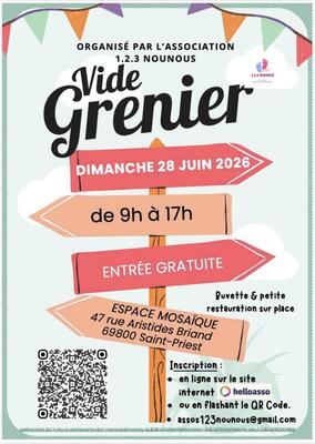 Venez participer au vide-grenier 2ème édition de l’association 1,2,3 nounous saint-priest venez chiner, vendre ou simplement passer un moment convivial en famille ou entre amis!!