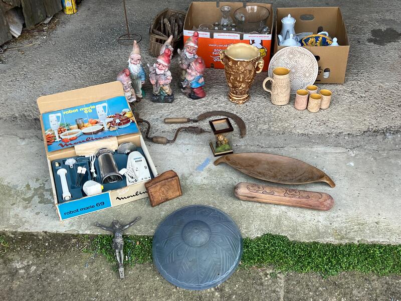 Divers articles : mobiliers, quelques vêtements, petit coin brocante, livres, déco, vase en résine, porte-clés, bocaux, 2 tables basses, 2 plaques en verre pour table, 1 micro-ondes, 1 parc pour bébé, 3 porte-vélos de toit de voiture, 3 coudes conduits isolés, piliers, 1 bac de douche, etc,,,