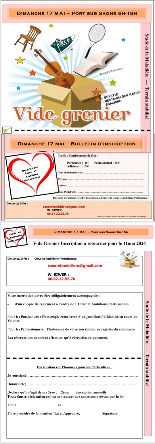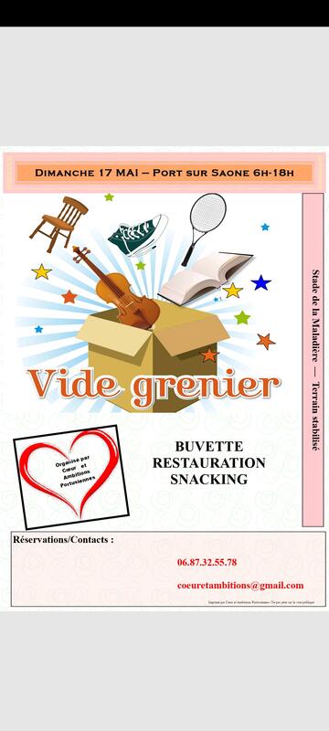 Vide-grenier organisé le 17 mai 2026 par l'association cœur et ambitions portusiennes au stade de la maladière (terrain stabilisé) à port sur saône