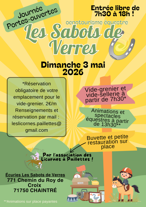 Vide grenier et vide sellerie à l’occasion des portes ouvertes des sabots de verres. Animations toute la journée jusqu’à 18h