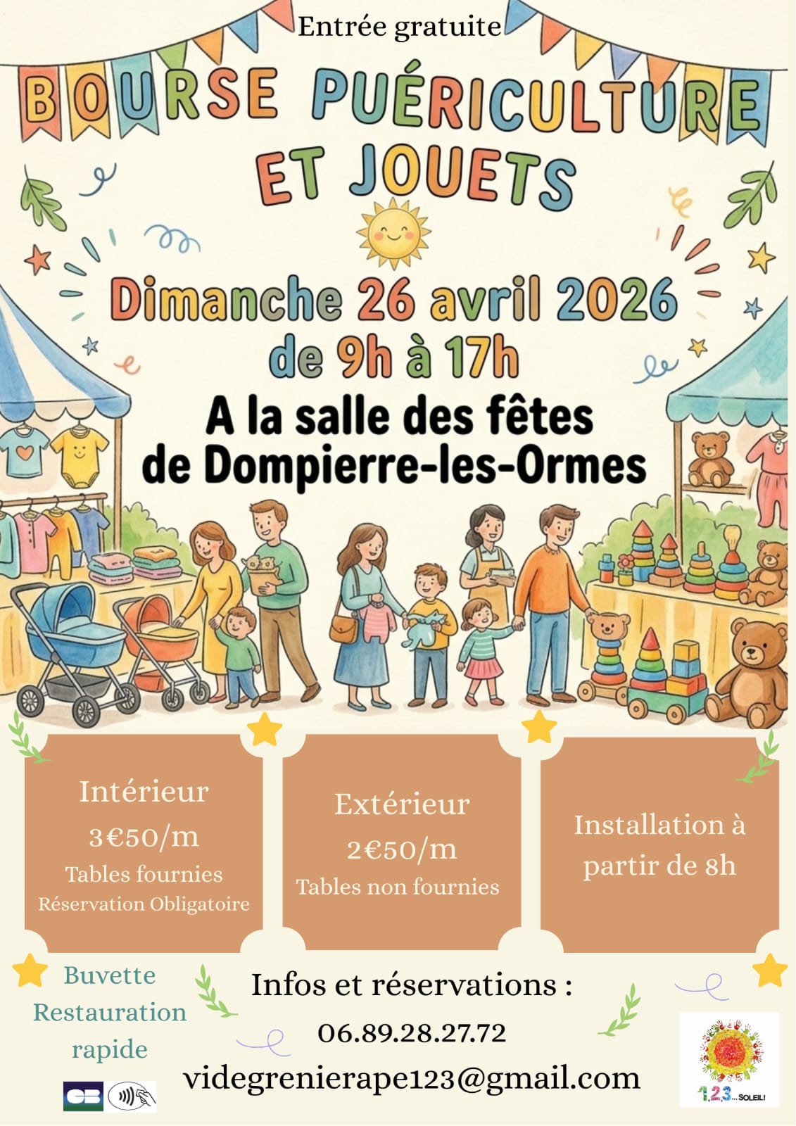 Bourse jouets et puériculture organisée par l'association de parents d'élèves 1, 2, 3 ... Soleil ! Du rpi de dompierre-les-ormes / montmelard.