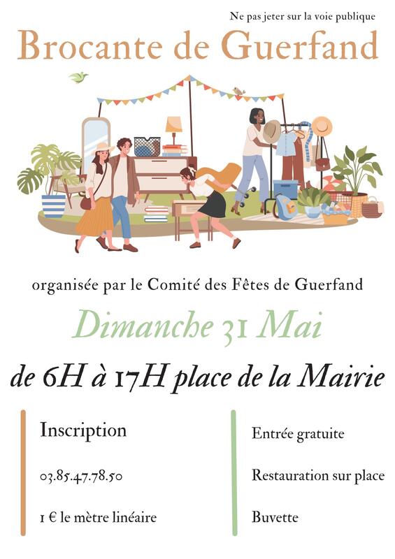 La brocante de guerfand : - inscription par téléphone à la maire de guerfand ou par e-mail à l'adresse suivante : - buvette et restauration sur place - 1 € le mètre linéaire