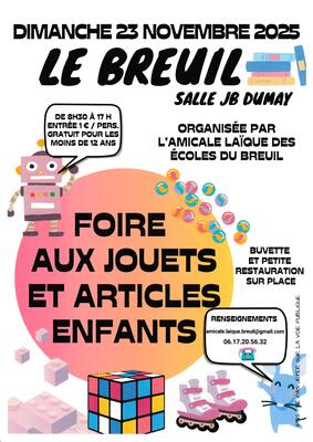 L'amicale laïque propose aux visiteurs une foire aux jouets et articles pour enfants, agrémentée d'un service buvette et restauration rapide, le 23 novembre 2025 de 8h30 à 17h. Manifestation au profit des écoles du breuil.