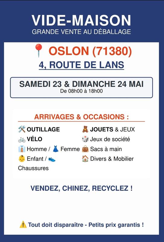 nous organisons une grande vente au déballage (vide-maison) le week-end du 23 et 24 mai 2026 à oslon. Nous vidons nos placards, notre garage et notre atelier : il y a des pépites pour tout le monde et à prix très doux !