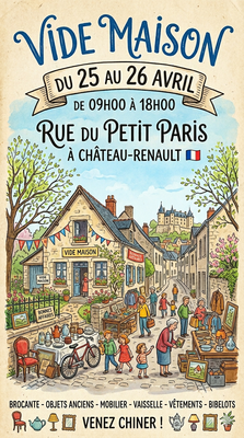 Bonjour je vous propose un vide maison dans la ville de château renault le 25 et 26 avril de 09h00 à 18h00 rue du petit paris, mobilier + équipements de jardins, outils + bibelots + etc veuillez su...