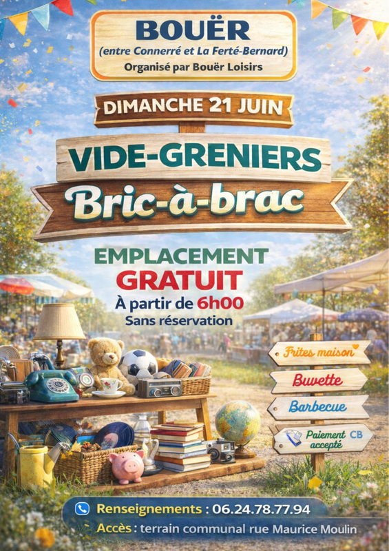 Organisé par l'association bouër loisirs, le vide-greniers aura lieu sur le terrain communal du village de bouër, rue maurice moulin.