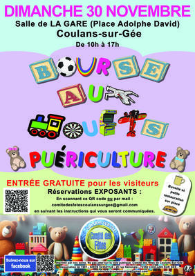 Bourse aux jouets & puériculture dimanche 30 novembre 2025 de 10h à 17h salle de la gare – place adolphe david, coulans-sur-gée entrée gratuite pour les visiteurs ! Venez faire le plein de bonnes affaires avant les fêtes ! Jouets, articles de puériculture..., il y en aura pour tous les goûts sur place : buvette & petite restauration pour une pause gourmande