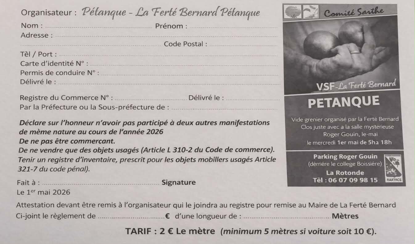 Brocante organisée par le club du vsf pétanque de la ferté-bernard, ouverte à tous les particuliers et professionnels. La vente de boissons et de nourriture est assurée par les organisateurs.