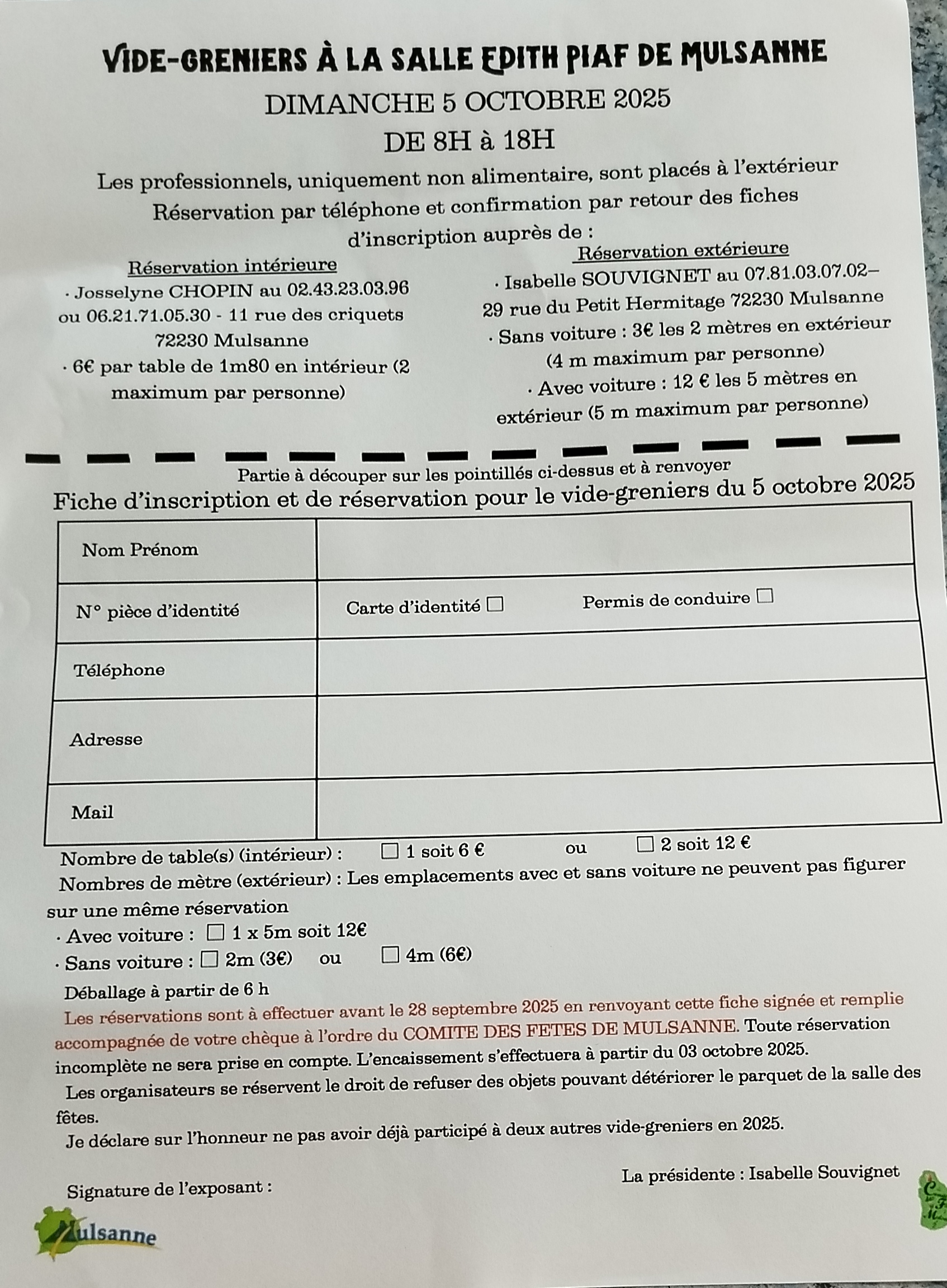 Le comité des fêtes de mulsanne organise son vide greniers annuel. Ouvert dès 8 h 00 pour les visiteurs.