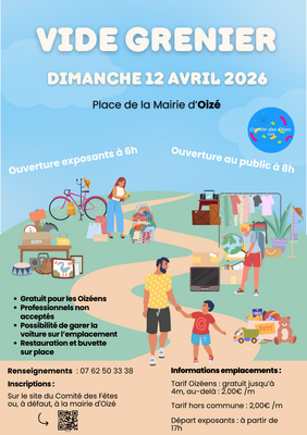 rendez-vous le dimanche 12 avril 2026 sur la place de la mairie d’oizé pour une journée brocante et bonnes affaires.