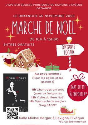 Marché de noël des écoles publiques de savigné l'évêque avec plusieurs exposants, chants de noël des enfants (11h), arrivée du père noël (12h) et spectacle de magie en déambulation. (14h-16h30)
