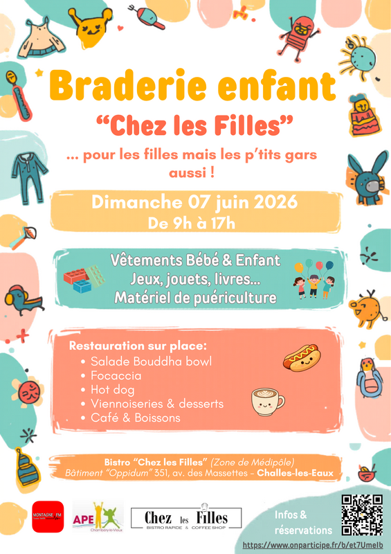 Les filles sont heureuses de vous convier à leur première braderie enfant le dimanche 07 juin 2026 de 09h à 17h au restaurant ! Matériel de puériculture, vêtements pour bébés et enfants, jeux, jouets, livres et bien d'autres pépites à dénicher ! Nous vous attendons nombreux pour passer cet agréable moment avec nous ! Restauration, boissons, encas maison et bonne humeur seront au rdv :)
