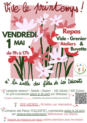 Vendredi 01 mai 2026 de 09h00 à 17h00 331 route de la combe - cour de l'école, arrivée des visiteurs à 9h, buvette sur place repas possible sur place, lasagne et desserts local et maison, 13€ : sur reservation = parking attenant, ateliers et partage de graines et plants