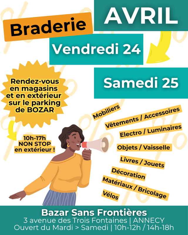 Chaque dernier vendredi et samedi du mois, retrouvez l’opération « braderie » à prix solidaires chez bazar sans frontières. Au programme, de bonnes affaires dans l’ensemble de nos magasins : objet et vaisselle, vêtements et accessoires, mobiliers, livres et jouets, electro, vélos, matériaux et bricolage… venez nombreux découvrir ce nouveau rendez-vous mensuel et dénicher vos prochaines pépites !