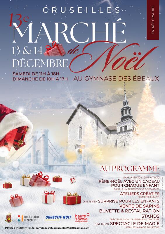 Le comité des fêtes de cruseilles et objectif nuit vous invitent à découvrir un marché de noël chaleureux et authentique, réunissant plus de 60 exposants. Créateurs, artisans, producteurs et stands gourmands vous proposeront un large choix de cadeaux, de spécialités et d’idées festives :
