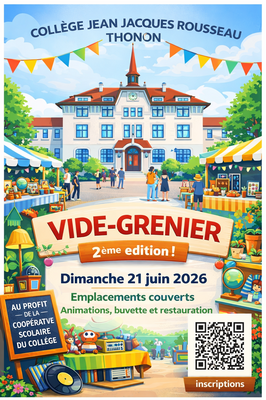 Bienvenue au 2ème vide-grenier du collège jean-jacques rousseau ! La vente des emplacements se fait au profit de la coopérative scolaire du jean-jacques rousseau. Cette association participe financièrement à la vie de l'établissement, dans le collège et pour des sorties. Nous vous attendons nombreux !