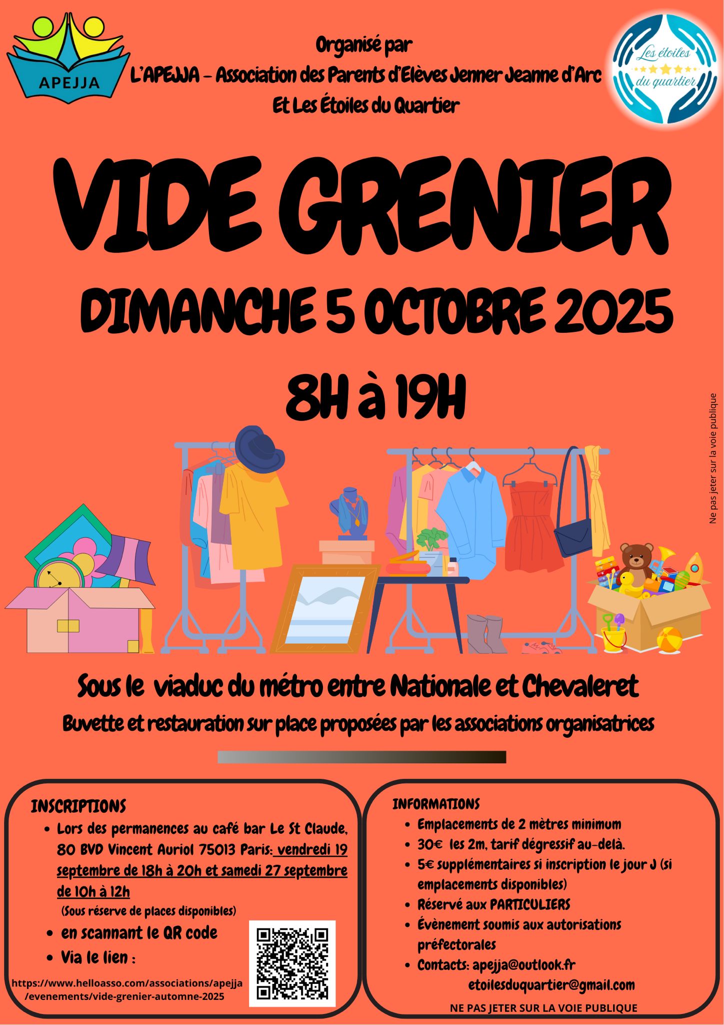 Emplacements de 2 m minimum 30 eur les 2 m avec profondeur. Tarif degressif 5 eur supplémentaires si inscription le jour j autorisation de la mairie et prefecture validéés inscriptions: -permanences en présentiel: X vendredi 19 septembre de 18h à 20h X samedi 27 septembre de 10h à12h -en scannant le qr code sur l'affiche -via le lien: https://www.helloasso.com/associations/apejja/evenements/vide-grenier-automne-2025 contact: