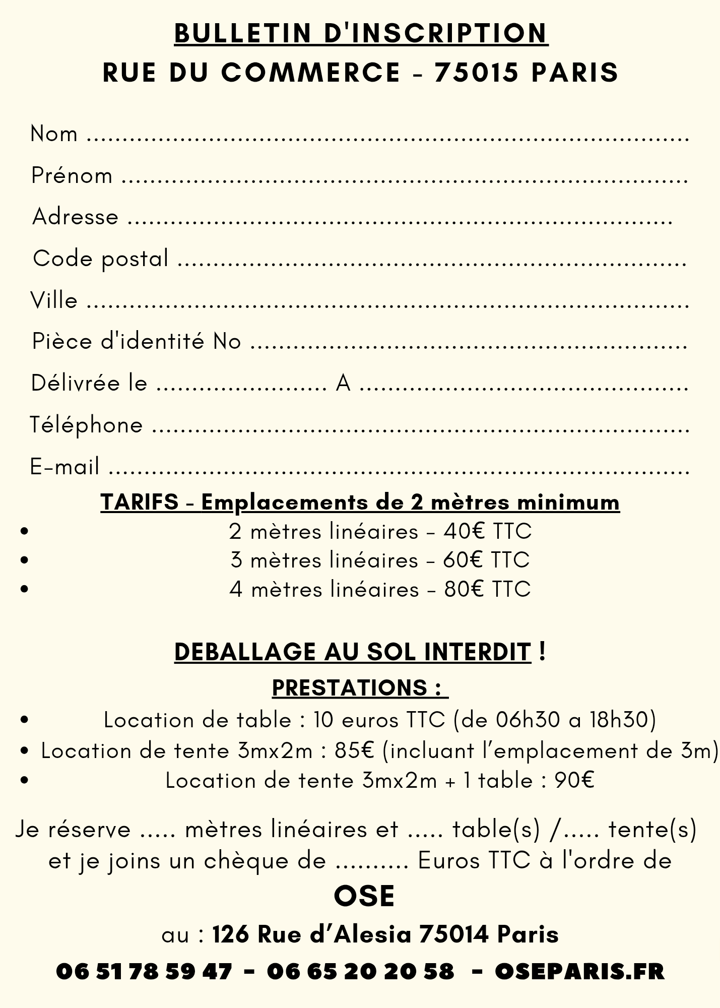 Inscriptions organisées sur place (sous réserve d'emplacements disponibles) le jeudi 23 octobre de 16h00 à 18h00, face au 85 rue du commerce 75015 paris.